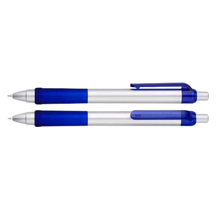 Bolígrafo plástico «Praxis» con cuerpo plateado, grip y clip de color traslúcido. Escritura azul.